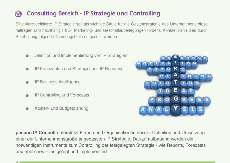 pascon IP Consult unterstützt Firmen und Organisationen bei der Definition und Umsetzung einer der Unternehmensgröße angepassten IP Strategie. Darauf aufbauend, werden die notwendigen Instrumente zum Controlling der festgelegten Strategie – wie Reports, Forecasts und ähnliches – festgelegt und implementiert.