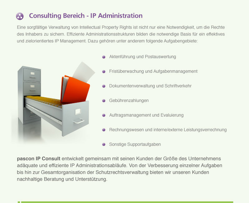 Eine sorgfältige Verwaltung von Intellectual Property Rights ist nicht nur eine Notwendigkeit um die Rechte des Inhabers zu sichern. Effiziente Administrationsstrukturen bilden die notwendige Basis für ein effektives und zielorientiertes IP Management. Dazu gehören unter anderem folgende Aufgabengebiete:
