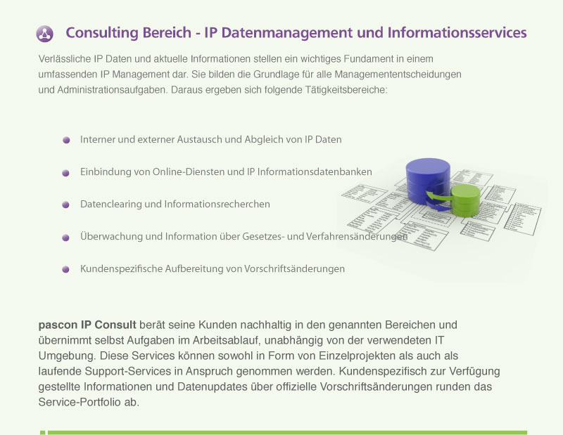 pascon IP Consult berät seine Kunden nachhaltig in den genannten Bereichen und übernimmt selbst Aufgaben im Arbeitsablauf, unabhängig von der verwendeten IT Umgebung. Diese Services können sowohl in Form von Einzelprojekten als auch als laufende Support-Services in Anspruch genommen werden. Kundenspezifisch zur Verfügung gestellte Informationen und Datenupdates über offizielle Vorschriftsänderungen runden das Service-Portfolio ab.