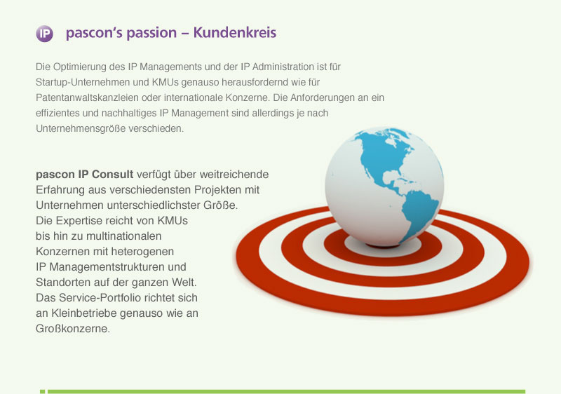 pascon IP Consult verfügt über weitreichende Erfahrung aus verschiedensten Projekten mit Unternehmen unterschiedlichster Größe. Die Expertise reicht von KMUs