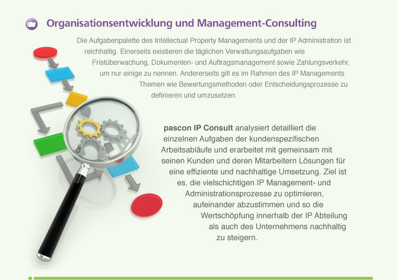pascon IP Consult analysiert detailliert die einzelnen Aufgaben der kundenspezifischen Arbeitsabläufe und erarbeitet mit gemeinsam mit seinen Kunden und deren Mitarbeitern Lösungen für eine effiziente und nachhaltige Umsetzung. Ziel ist es, die vielschichtigen IP Management- und Administrationsprozesse zu optimieren, aufeinander abzustimmen und so die Wertschöpfung innerhalb der IP Abteilung als auch des Unternehmens nachhaltig zu steigern.