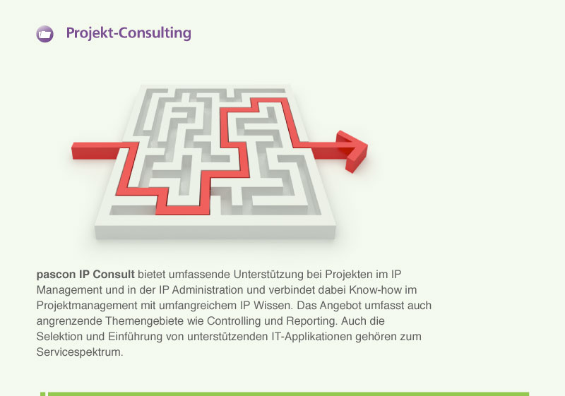 pascon IP Consult bietet umfassende Unterstützung bei Projekten im IP Management und in der IP Administration und verbindet dabei Know-how im Projektmanagement mit umfangreichem IP Wissen. Das Angebot umfasst auch angrenzende Themengebiete wie Controlling und Reporting. Auch die Selektion und Einführung von unterstützenden IT-Applikationen gehören zum Servicespektrum