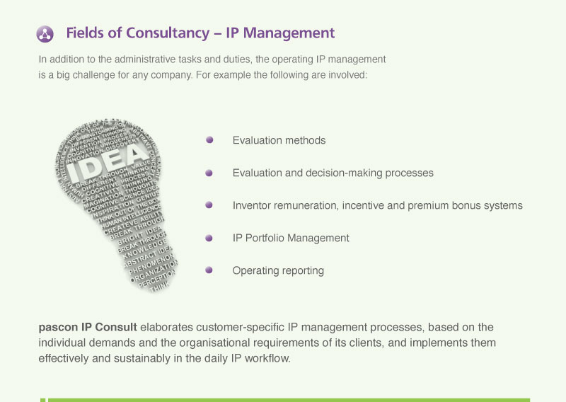 pascon IP Consult elaborates customer-specific IP management processes, based on the individual demands and the organisational requirements of its clients, and implements them effectively and sustainably in the daily IP workflow.