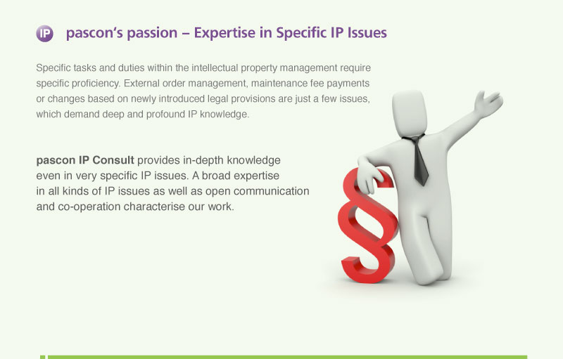 pascon IP Consult provides in-depth knowledge even in very specific IP issues. A broad expertise in all kinds of IP issues as well as open communication and co-operation characterise our work.
