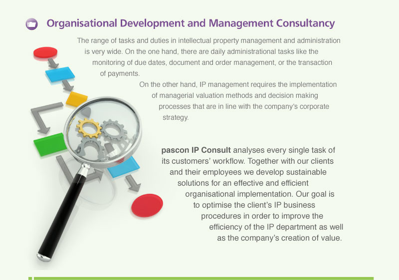 pascon IP Consult analyses every single task of its customers’ workflow. Together with our clients and their employees we develop sustainable solutions for an effective and efficient organisational implementation. Our goal is to optimise the client’s IP business procedures in order to improve the efficiency of the IP department as well as the company’s creation of value.